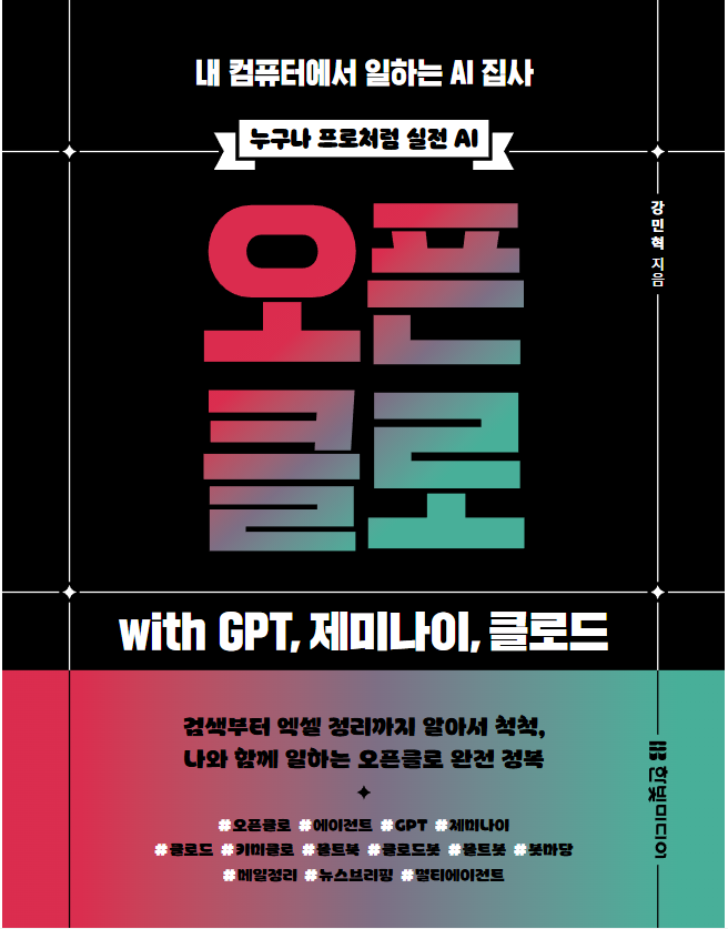 "한빛미디어 서평단 활동을 위해서 책을 협찬 받아 작성된 서평입니다." 4월에 리뷰할 책은 오픈클로 with GPT, 제미나이, 클로드 입니다. AI에 관심을 가지기 시작한 뒤로 감사하게도 한빛미디어를 통해 여러 AI 관련 책을 읽을 기회가 생겼습니다. 첫 리뷰 책부터 지금까지 자연스럽게 AI 흐름을 따라가며 읽을 수 있었고, 이 자리를 빌려 한빛미디어에 감사한 마음을 전하고 싶습니다.아마 이 글을 읽고 계신 분들도 저처럼 AI에 관심이 있는 분들이 많을 것 같습니다.물론 그중에는 이미 AI 흐름을 빠르게 따라가고, 이 책에서 다루는 오픈클로(OpenClaw) 정도는 예전에 설치해보고 활용까지 해본 분들도 계실 것입니다. 그런 분들은 제가 굳이 설명하지 않아도 공식 문서, GitHub, 커뮤니티, 최..