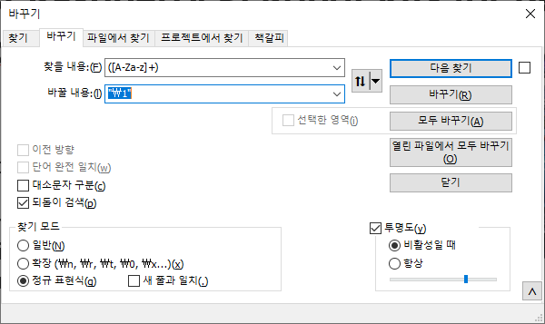 notepad++ (노트패드 플러스 플러스, 이하 npp)는 Don Ho 님이 만들고 있고 https://notepad-plus-plus.org/ 에서 배포하고 있습니다. 위 그림은 Ctrl + H 를 누르면 나오는 바꾸기 창(메뉴에서는 찾기->바꾸기 선택, 아이콘에서는 망원경 옆 ba 가 써진 버튼 선택)입니다. 여기에서 사용되는 정규식을 생각나는 대로 정리하도록 하겠습니다. 당연하게도(?) 그냥 글자(영어, 한글 등등)를 입력하면 그대로 찾아줍니다. 하지만 이렇게 찾으면 뭉뚱그리거나 어떤 규칙성을 갖는 문자열을 찾기에는 아쉽죠. vim 을 오래 쓰신다면 익숙해지게 되시는 정규식을 npp 에서도 쓸 수 있습니다. 위 바꾸기 창에서(찾기 창에서도 사용 가능합니다) '찾기 모드' 그룹에 보통 '일반'이 선..